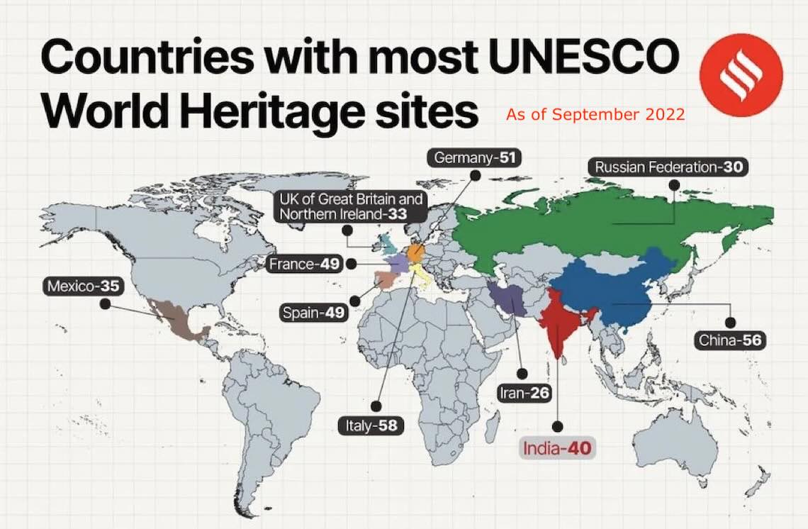 India offers 43 sites, with the Taj Mahal standing out as a global icon of beauty and history.